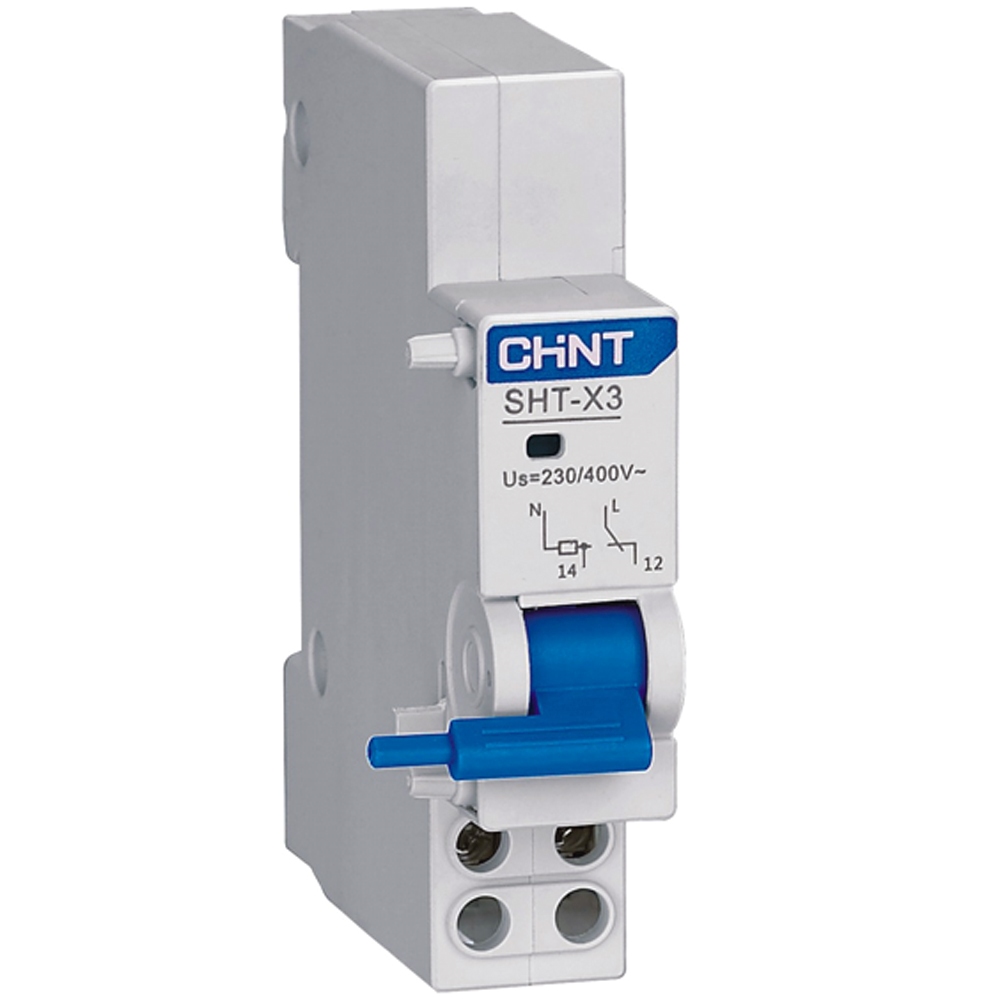 SHT-X3: Cuộn cắt từ xa (Shunt Trip), điện áp điều khiển 24–48V AC/DC, tiêu thụ công suất thấp, thời gian tác động <0.1s, cho phép cắt CB từ xa bằng tín hiệu điện, cách điện 500V, chịu xung điện áp cao, lắp DIN 35mm, chiều rộng 18mm, nhiệt độ làm việc -5°C đến +40°C